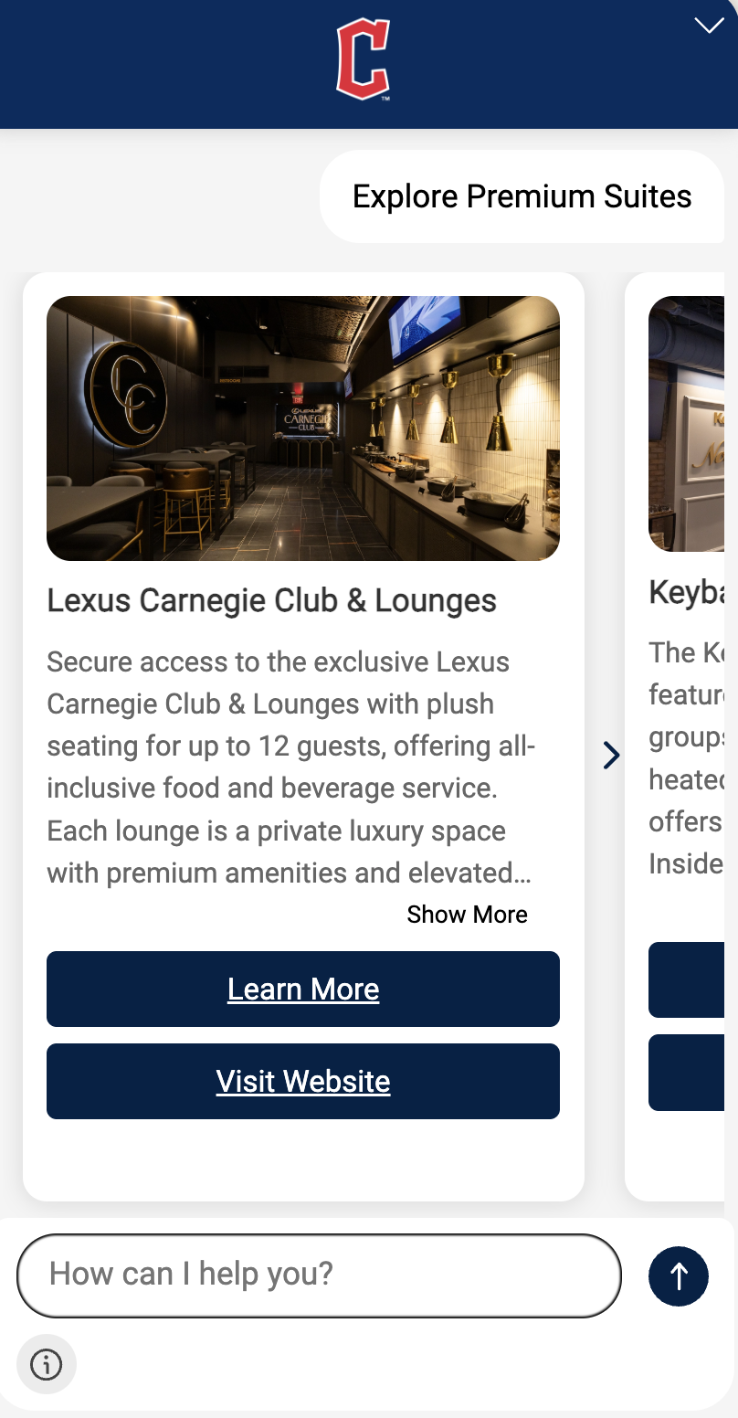 * **Premium Experiences:** Display premium seating, suite rentals, or VIP upgrades with pricing and availability. Encourage upsells during key sales moments.
