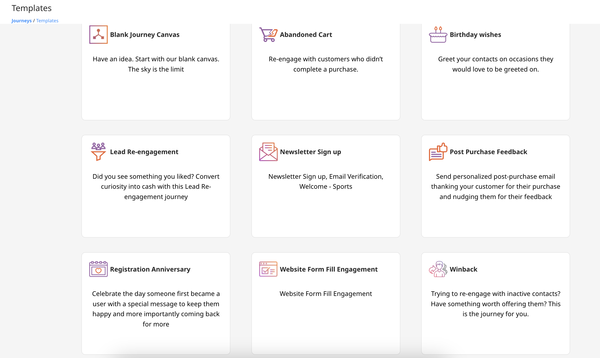 Marketing Engine offers pre-configured journey templates designed for common marketing scenarios, enabling you to quickly launch campaigns with pre-built workflows. These ready-to-use journeys come with pre-configured action blocks, allowing you to immediately start engaging contacts without building a journey from scratch.