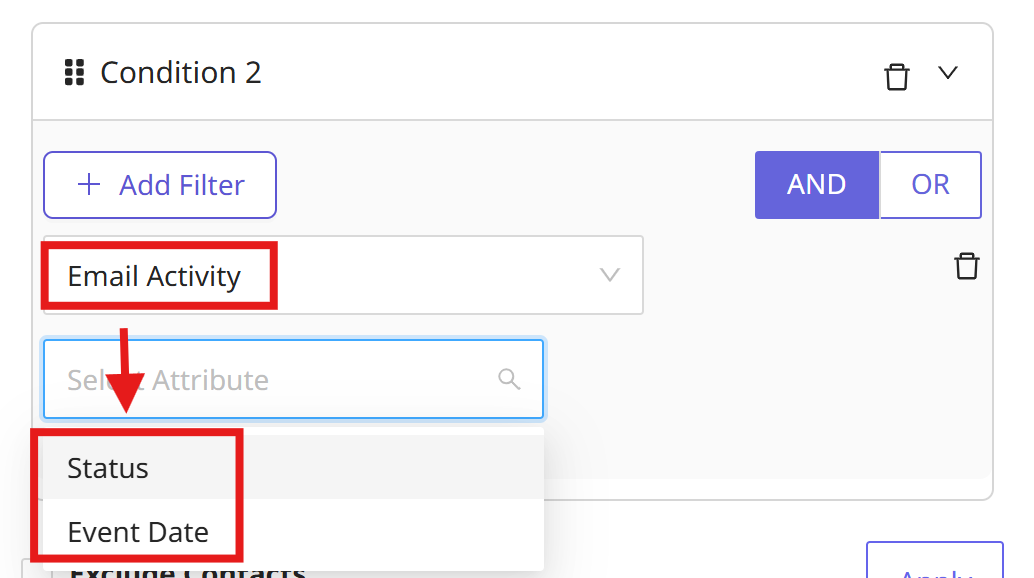 In Email Activity, you can select one of two attributes: Status or Event Date. The sub-fields are broken out below: