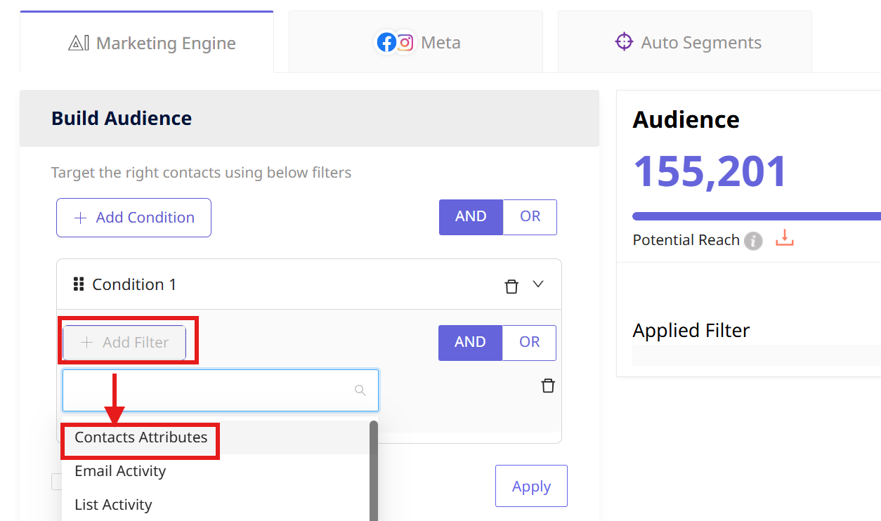 The Marketing Engine has filters for creating an audience that will be a part of your marketing campaign. You can customize the audience to every intricate factor to make the segmentation and targeting more effective.