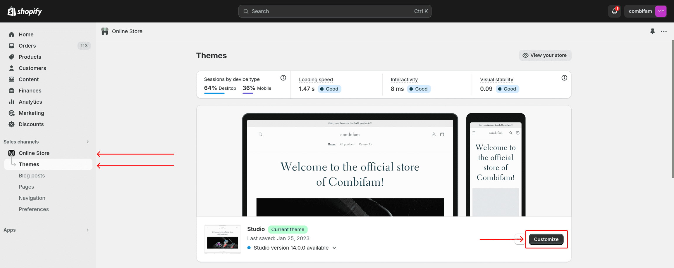 Log in to your Shopify store and navigate to Online Store, click on Themes, and then on the “Customize” button in the center of the page.
